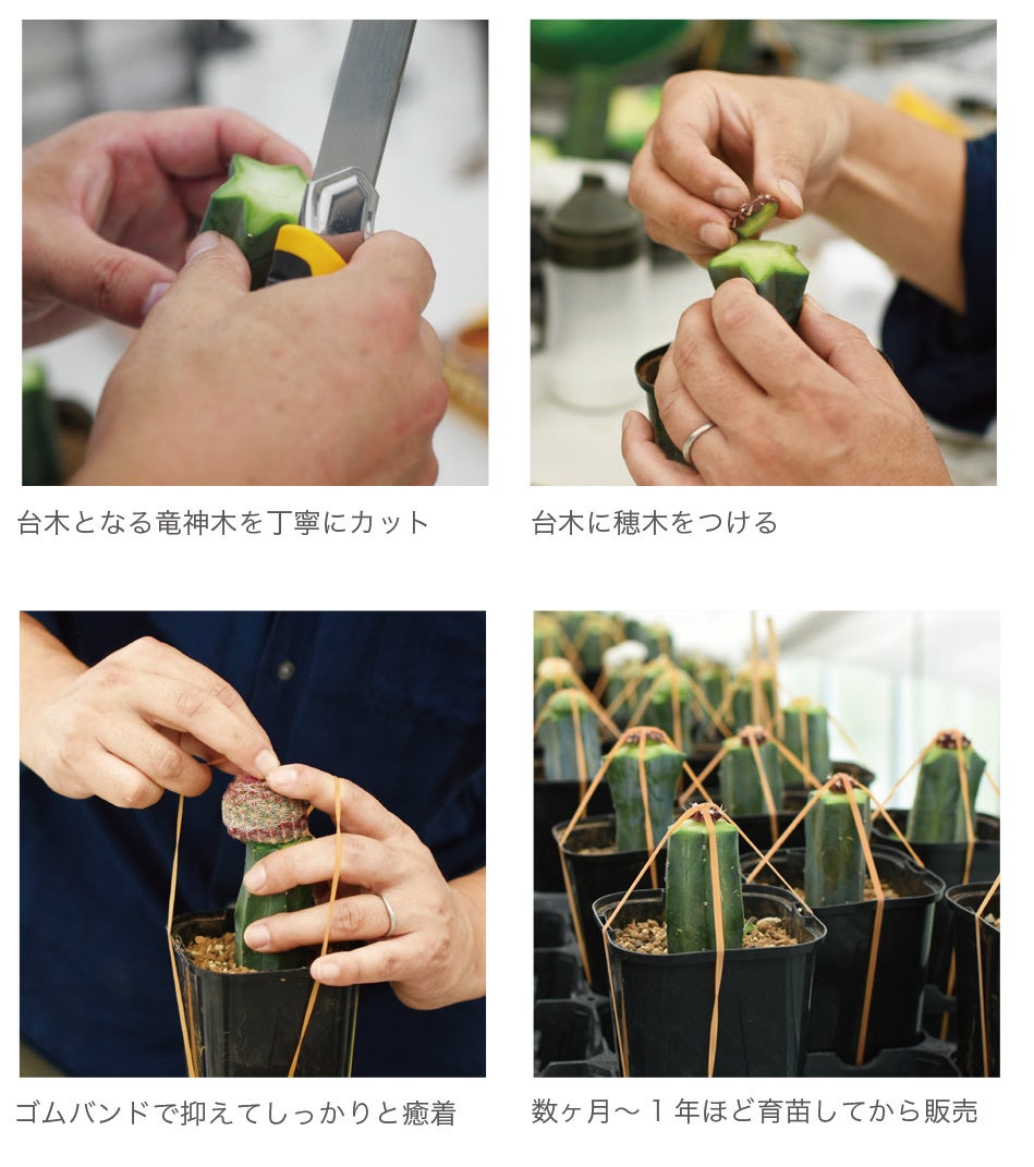 「サボテン接ぎ木とは、本来サボテンを早く大きくさせるための合理的な促成栽培の技法として用いられています。しかし、サボテンを別のサボテンの上に乗せたこの奇妙な姿には、 また新しいサボテンの魅力があると思っています。土に根を下ろすことをやめたサボテンは新しい風変わりな場所でみるみるうちに大きくなり、想像を超えるような風貌になっていきます。サボテンからは感じづらい “ 動き ” を、毎日のように感じることのできる楽しい相棒です。」