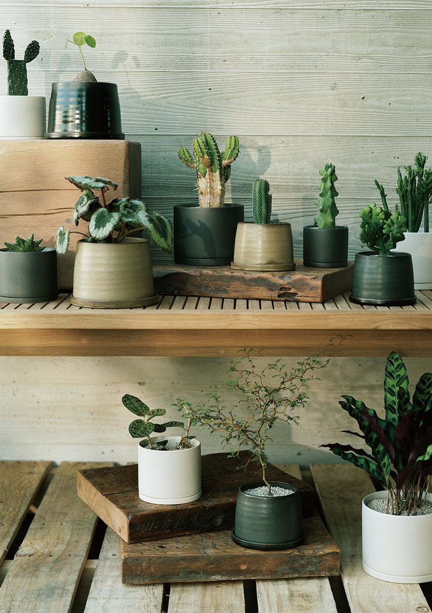 2019 年 10 月、植物のある心地よい暮らしを愉しめるように生まれたブランド MOLLIS。のびのびと育った植物に、それぞれの個性を引き立てるプラントポットをコーディ ネートしてお届けします。植物の監修には、“いい顔してる植物”をコンセプトに独自の美しさを提案する「叢」の小田康平を迎えました。仕入れた個性豊かな植物は、本社のある滋賀・彦根市に建設した自社温室で育てた後、お客様へ直送しています。住環境を踏まえ、鉢本体と受け皿をセッ トでデザインしたプラントポット、吊るした時の佇まいや日々の水やりを配慮したハンギングポットなど、様々な空間やインテリアと植物の調和を愉しめるラインナップです。