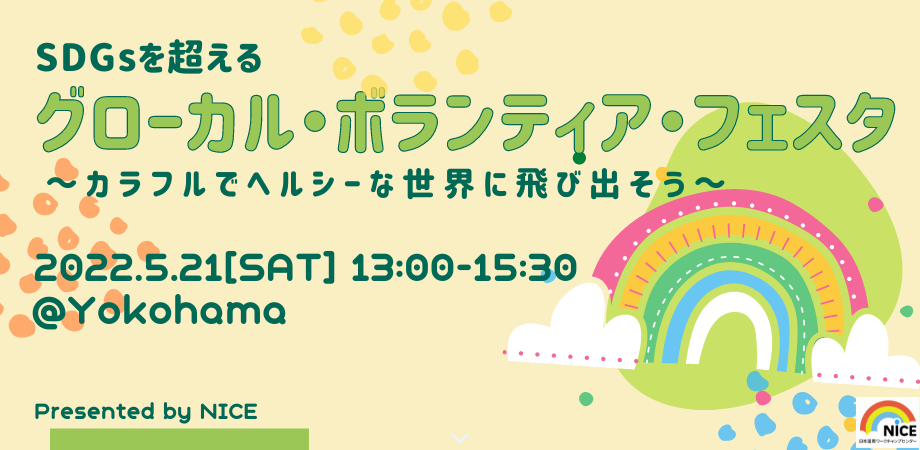 NPO法人NICE日本国際ワークキャンプセンター(全国事務局:神奈川県横浜市、代表:開澤 真一郎)は、2022年5月21日(土)に横浜市西スポーツセンターにて、「SDGsを超える!グローカル・ボランティア・フェスタ~カラフルでヘルシーな世界に飛び出そう~」を開催いたします。国際ボランティア経験者と交流し、環境・子ども・教育・農業などの分野における国内・海外ボランティア活動体験や、現地へのSDGsの成果について知ることができるイベントです。参加費無料