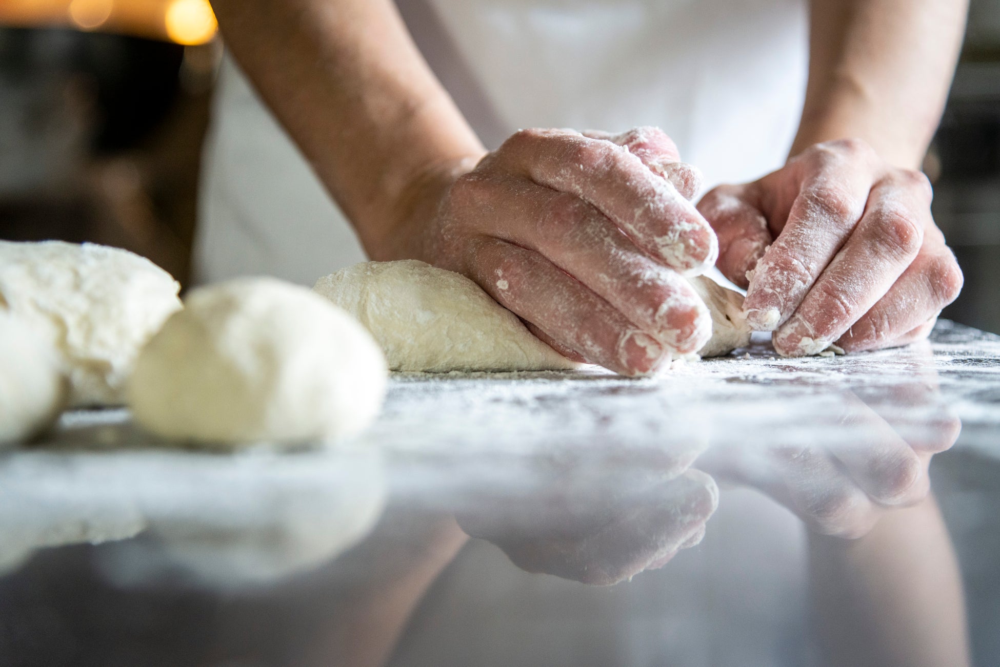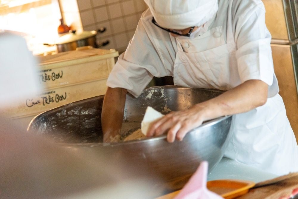 時間と力がいる大変な作業ですが、食感や小麦本来のおいしさを引き出すために、手間暇をかけて仕上げています。セ・トレボンが福岡平尾に創業して20年以上、創業当時よりフランスの伝統的な製法"手ごね"にこだわり、日々パンを作っています。
