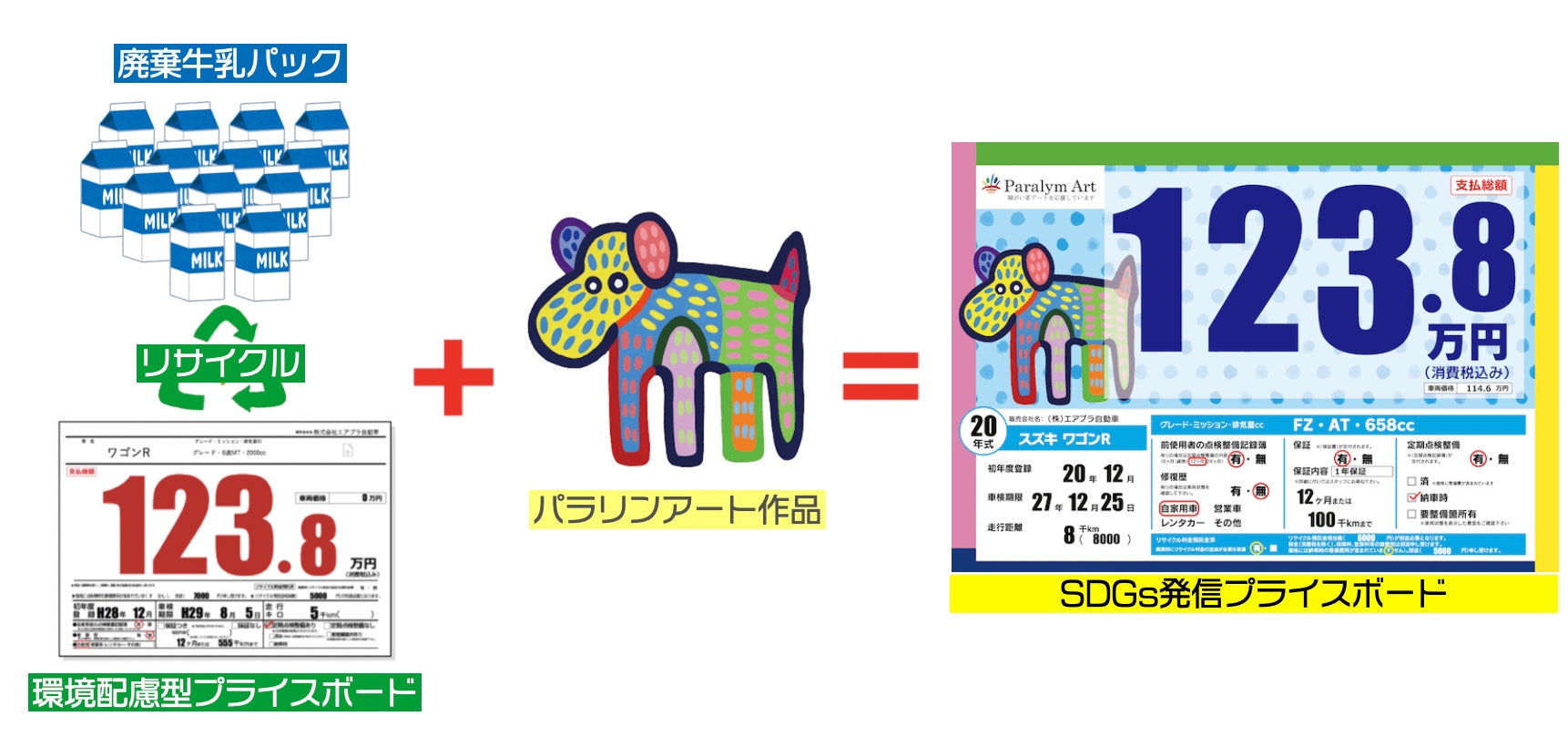 自動車公正競争規約改正に伴い、中古車の「支払総額」表示義務化が2023年10月に施行されます。それに合わせてプライスボードの項目内容において規約改正に合わせた適切な表記が求められます。それを見据えて規約改正に対応したプライス作成システム「エアプラ」のプロモーション展開のため、地球環境に優しい牛乳パックでつくられたプライスボード(ミルクパネル)をトライアル申し込み販売代理店に提供いたします。プライスボードのデザインにはパラリンアート作品を採用、環境保護とSDGsを意識した自動車業界では初の取り組み※となります。