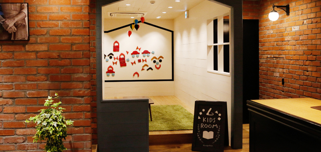 店内は、木材やレンガを使用した落ち着きのある空間。子どもが遊べるキッズスペースには、革でできたマグネットや絵本もあり、親子でゆっくりとくつろげます。