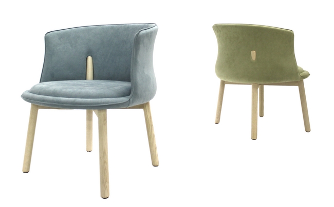 アルカンターラの展示する新製品の例では、カッペリーニの「S-Chair」限定版(カモフラ柄)、そしてミッドナイト・ブルーの生地を使った[ポーランドのデザイン会社]Noti の「Le Monde」ソファがあります。