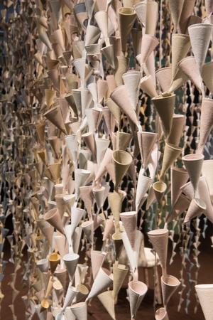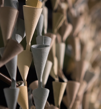 nendoの芸術的なビジョンは、微妙な色使いから着想された柔軟なアルカンターラ素材による植物のつるのようなウォールです。薄い素材で作られたコーンの形がロマンチックに積み重ねられています。この作品はアルカンターラ素材本来の美的・感覚的性質を強調するとともに、機能的特性にもスポットライトをあてています。作者の佐藤オオキ氏はこう語っています。「このインスタレーション作品の強さと美しさは、すべてこのために使ったアルカンターラだから。熱圧着したコーンが唯一の構造要素であり、その素材本来がもつグリップ性によりお互いがつながっています。」(英文からの翻訳)。