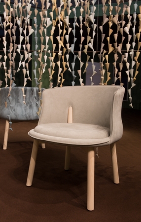 同じ会場で展示されるインテリア・アイテムには、フランスLigne Roset(リーン・ロゼ)の「Togo」ソファ(色:アシッド・グリーン)、白黒の千鳥格子のアルカンターラ・ローマを使った同じブランドのアームチェア、そしてGiulio Cappellini e Paola Navone コレクションのアルカンターラ・インテリア新色(明るいバーガンディ)を使ったEumenes(エウメネス)の「eu/phoria」チェアがあります。また「Conic Vine」インスタレーション作品のそばには、nendoがカッペリーニのためにデザインした「Peg」アームチェアも並んでいます。