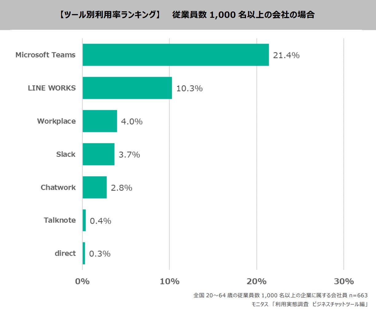 従業員数1,000名以上の企業に属する人に聞いたチャットツールごとの利用率では、上位から「Microsoft Teams」21.4%、「LINE WORKS」10.3%、「Workplace」4.0%。従業員数の多い企業ではダントツで「Microsoft Teams」の利用率が高い結果となりました。
