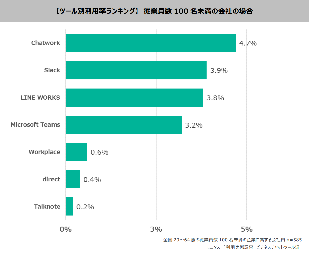 従業員数100名未満の企業に属する人に聞いたチャットツールごとの利用率では、上位から「Chatwork」4.7%、「Slack」3.9%、「LINE WORKS」3.8%が続く結果に。「Chatwork」など、従業員数の多い企業でのランキング上位ではないツールが上位に入っています。