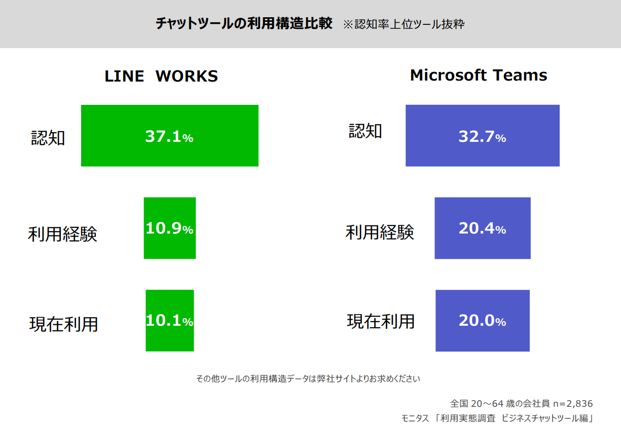 これらを比較すると、認知率では「LINE WORKS」が「Microsoft Teams」をやや上回るものの、利用経験・現在利用においては、「Microsoft Teams」が「LINE WORKS」を10ポイント程度上回っていることがわかります。