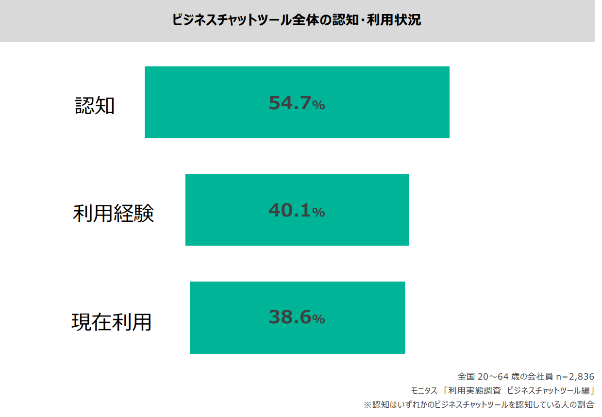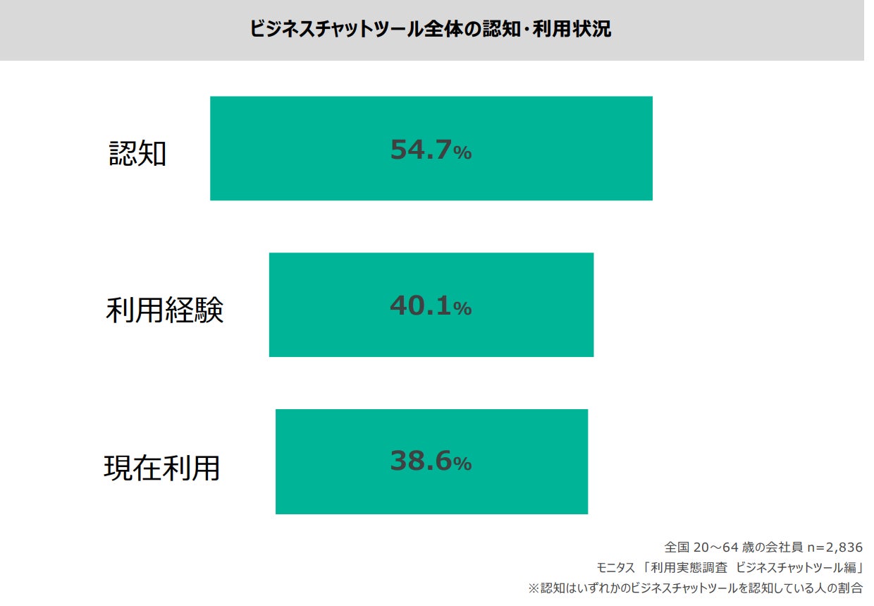 全国の会社員に聞いたビジネスチャットツールの認知・利用状況について、認知率54.7%、利用経験率40.1%、現在利用率38.6%という結果に。