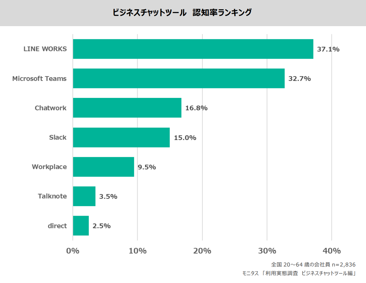 では、実際にはどんなビジネスチャットツール認知されているのでしょうか。認知率上位から「LINE WORKS」37.1%、「Microsoft Teams」32.7%、「Chatwork」16.8%が続いています。上位には有名企業名を冠したツールがランクインしています。