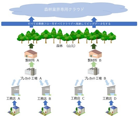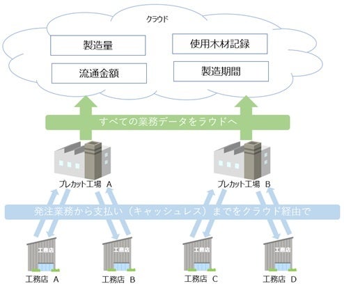 先ずはプレカット工場と地域工務店との取引おけるキャッシュレス化を開始し、以後、製材所と工務店、山元(山主や素材生産業者)と工務店の取引に拡大していきます。