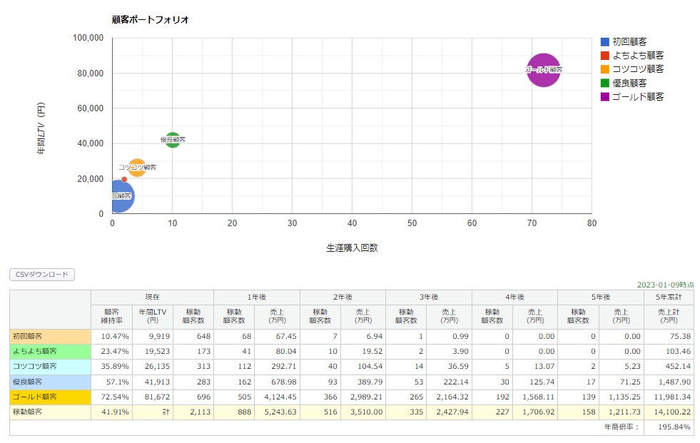 現在の継続率(顧客維持率)を元に、5年先までの顧客数と売上を予測・表示します。顧客BSのポイントは、「新規顧客を獲得せずに既存顧客だけで売上を構築するとどうなるか」を予測する点にあります。つまり、ショップあるいはブランドを支持しファンになってくれた方の人数(稼働顧客数)と得られる売上(5年間の売上累計額)を、CRMの成果として数字で測ることが可能になりました。