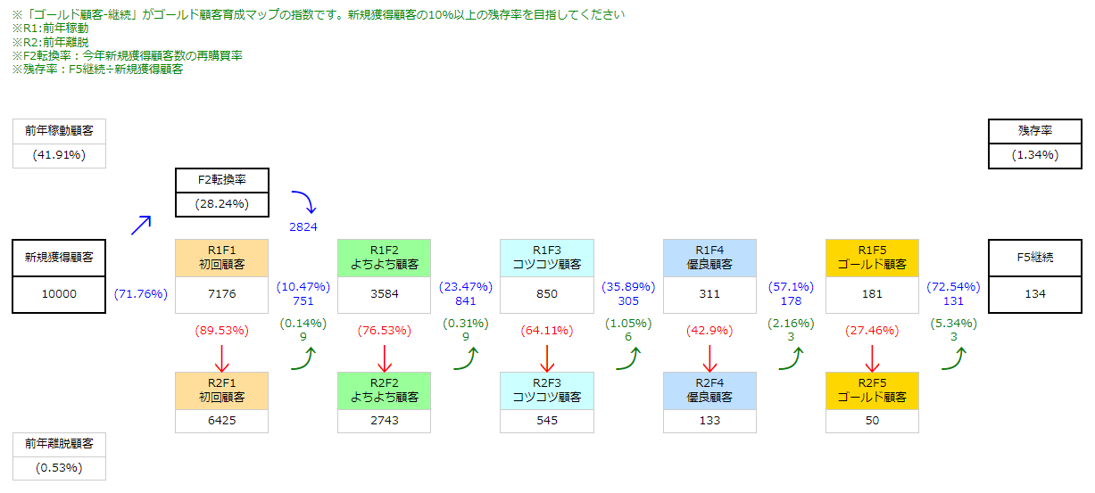 F1~F5までの顧客分類ごとの維持率・離脱率・復帰率をマップにし、最終的に新規獲得顧客がどのくらい「F5(ゴールド顧客)継続」まで残存するかを「残存率」という指数で表したものです。残存率は、新規獲得に依存したEC運営になっていないかどうかを判断する指標になります。