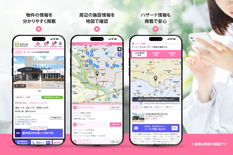 物件の詳細情報のページでは、物件の情報を分かりやすく掲載。気になる物件をサイト上でカンタンにお問い合わせいただけます。物件の地図では周囲のコンビニ・公共交通機関といった周辺施設の情報を掲載している他、土砂災害・浸水などのハザード情報も掲載しているので、サイト内で物件の立地もしっかり確認でき、安心して物件を選んでいただけます。