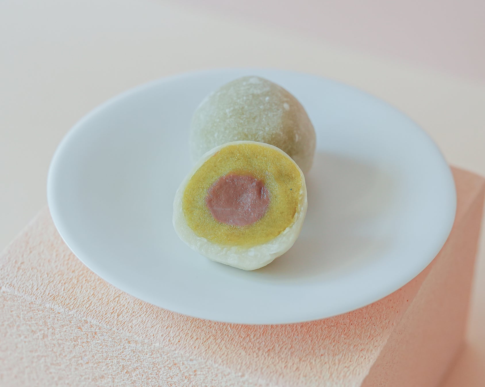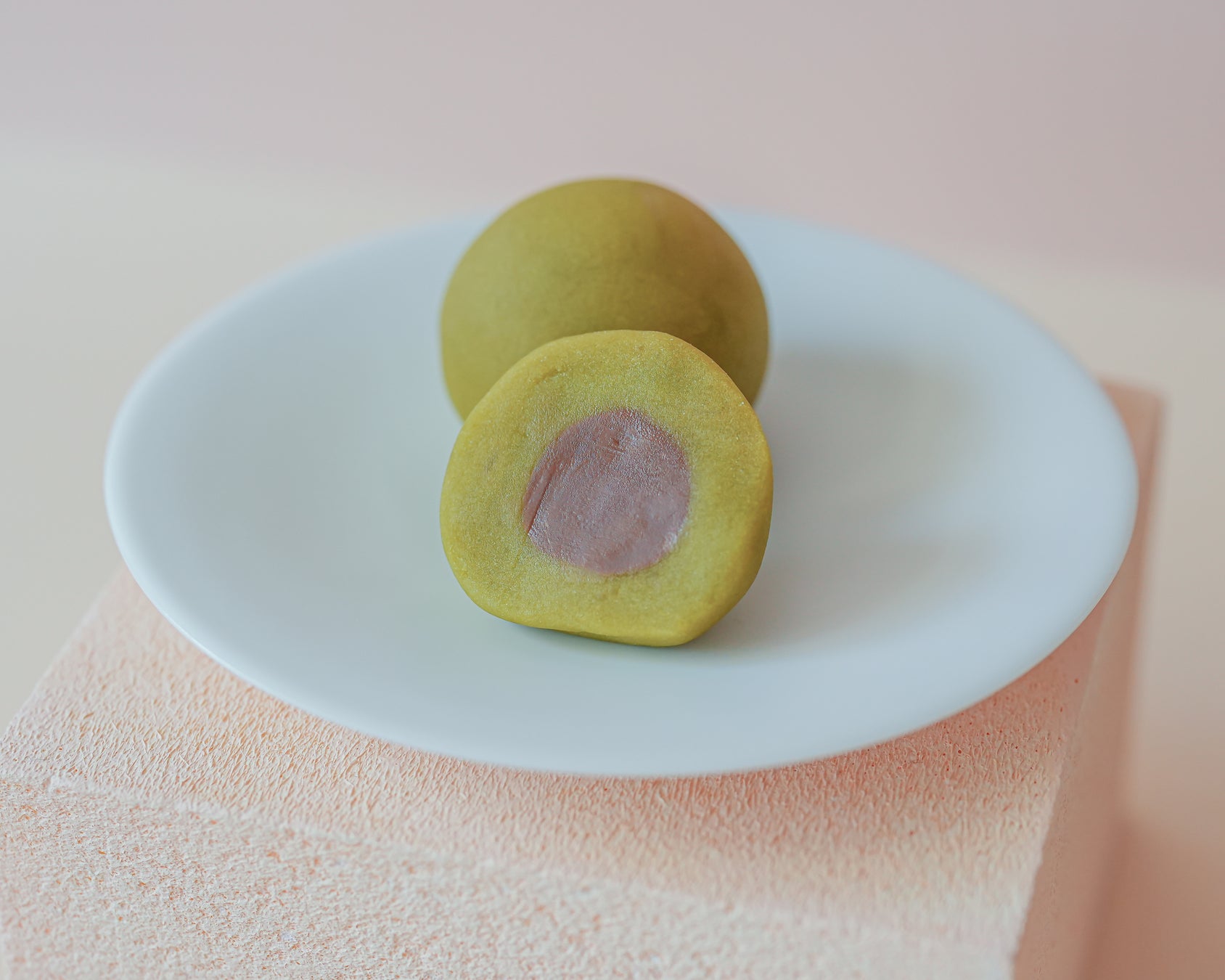 白玉粉を使ったやわらかな求肥で、あんこショコラ〈緑茶〉を包みました。ほろ苦い緑茶餡のショコラと求肥の甘さがよく合います。