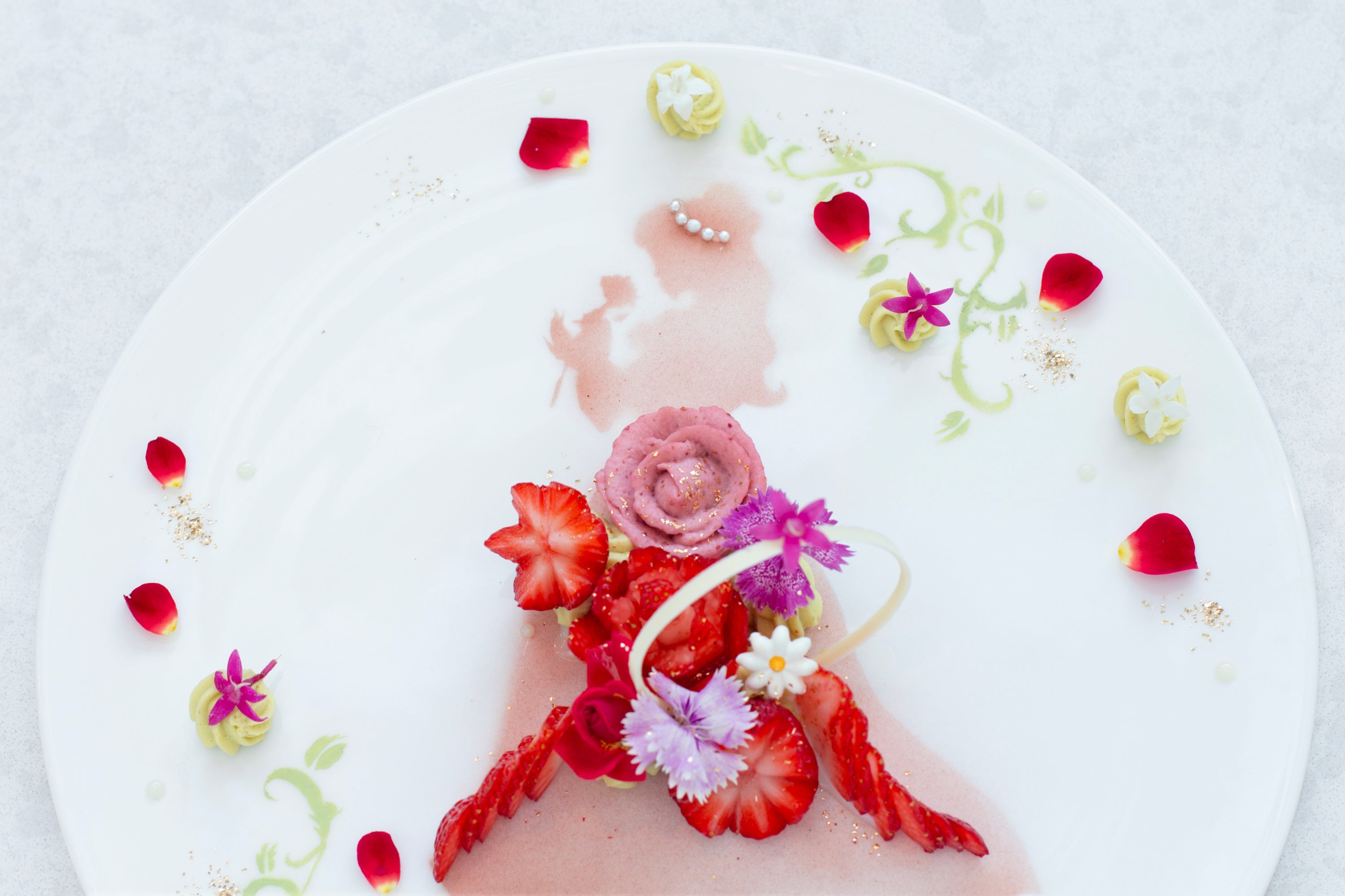 「恋する乙女」がテーマのシグネチャープレートには、しっかりとした甘みと穏やかな酸味が特長の「恋みのり」を選びました。「恋みのり」の大輪のバラが咲きほころび、一折ごとに思いを込めたバラ色のオートクチュールドレスを纏う一皿に仕立てました。中央にはリング状のチョコレートで指輪を表現し、どこから見ても華やかになるよう細部までこだわります。