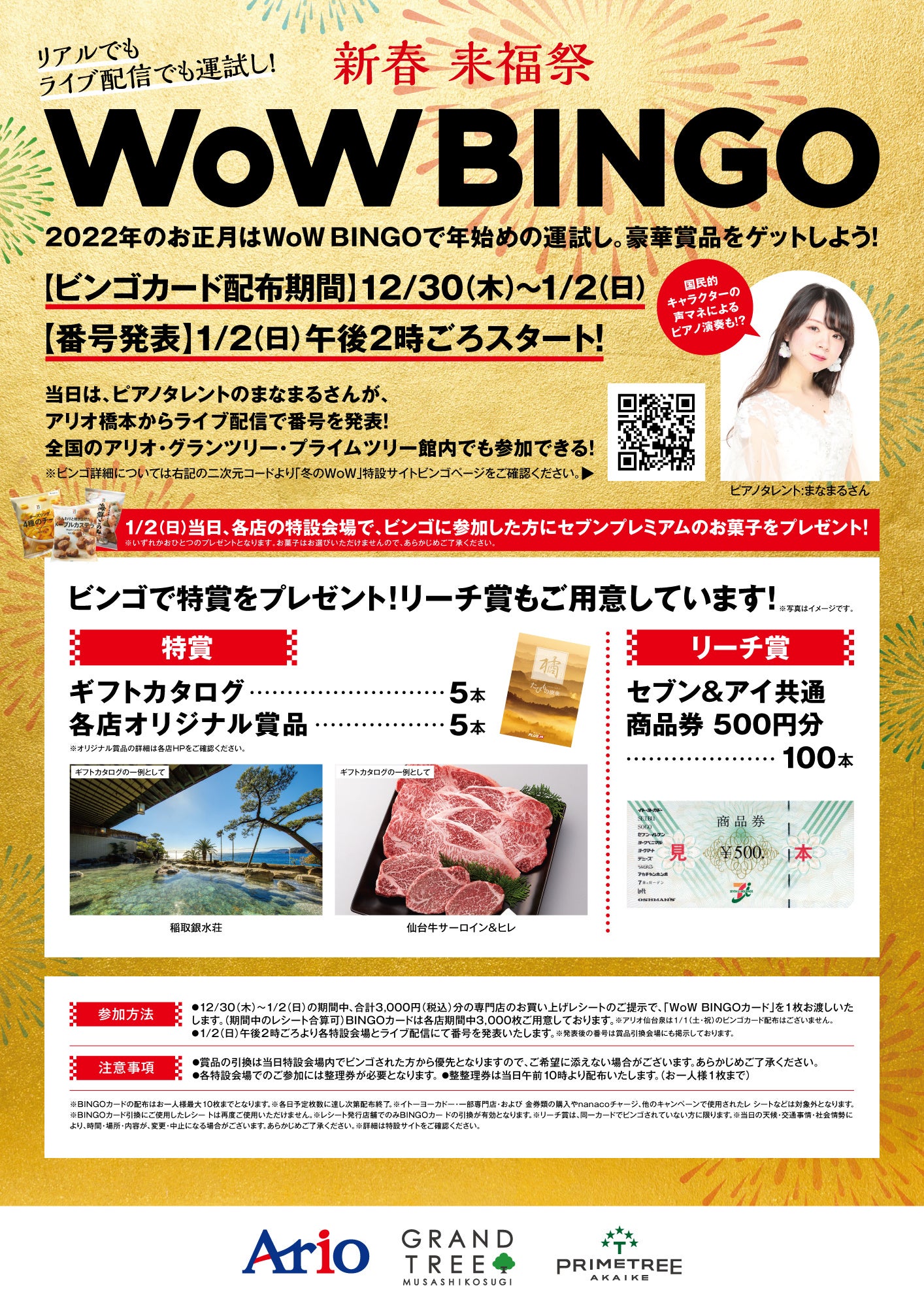 株式会社セブン&アイ・クリエイトリンク(代表取締役社長:泉井 清志)は複合型ショッピングセンターのアリオ各店・グランツリー武蔵小杉・プライムツリー赤池・セブンパーク天美にて、「冬のWoW(ワウ)」を12月26日(日)から開催いたします。「WoW」は、夏と冬に開催している、バーゲンやセール、イベントのテーマとなります。コロナ禍においてリアルな体験の機会が減り、また、人と人とのつながりも薄れました。今回の「冬のWoW」では、楽しさも失われた2年間を取り戻し、地域のお客様が安心して楽しみ、笑い、一緒にいられる喜びを分かち合えるよう、津軽三味線奏者の北村姉妹に表現していただきます。新春来福祭では、特製「来福朱印」や「WoW BINGO」など、様々なイベントをご用意しています。