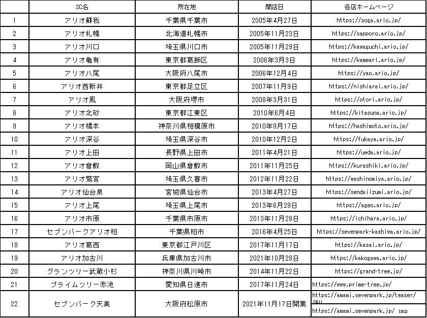 アリオ亀有、アリオ西新井、アリオ上尾、アリオ橋本、アリオ上田、アリオ八尾、アリオ加古川、アリオ倉敷