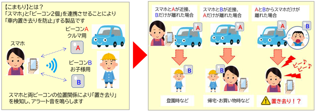 「こまもり」は取り付け工事など不要で、ビーコン(デバイス)とスマートフォンを連動することで手軽に置き去り防止対策が可能となります。置き去りの危険性を検知するとアプリが警告音とメッセージでお知らせします。