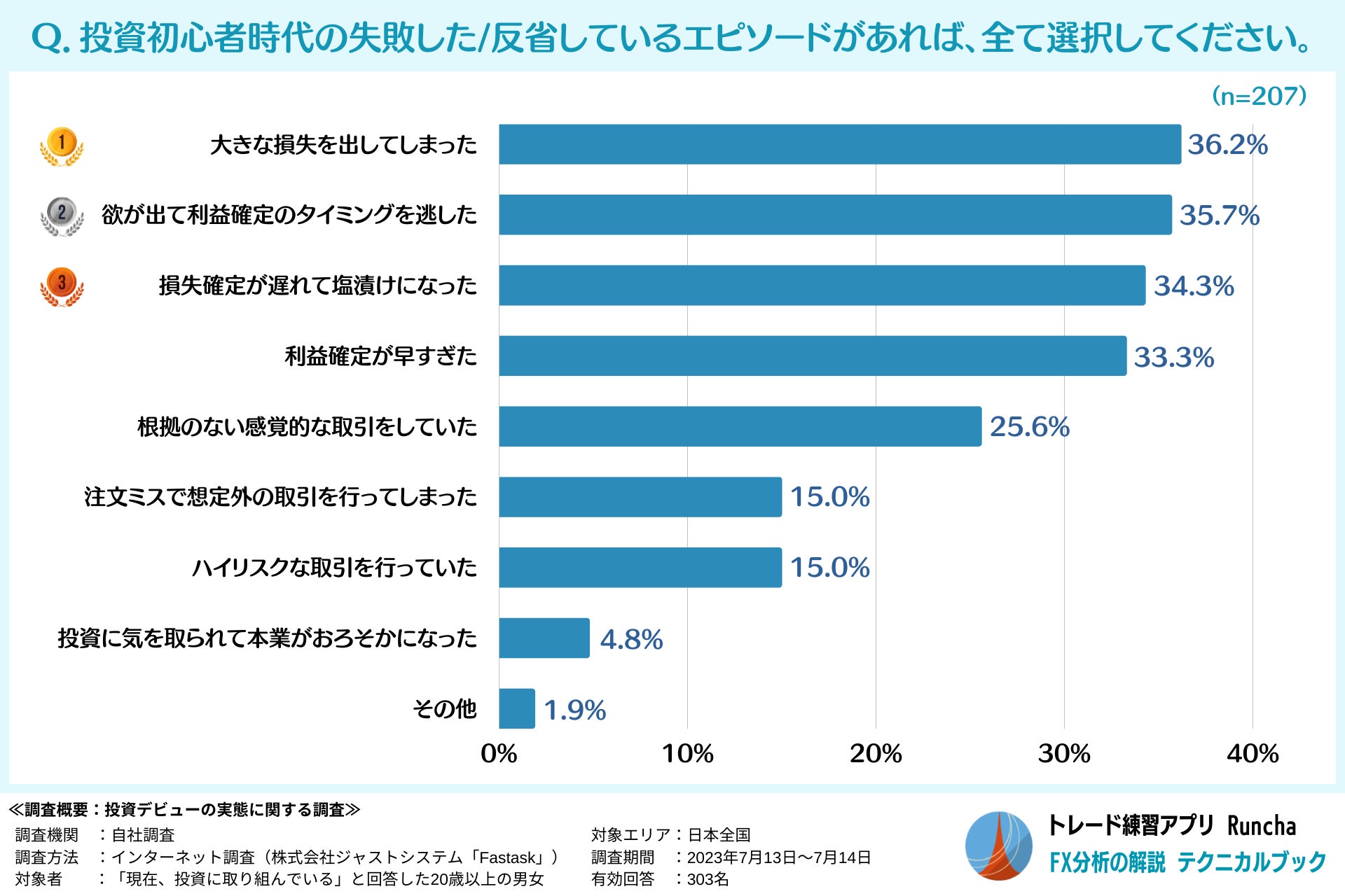 また、1位と僅差で「欲が出て利益確定のタイミングを逃した」の35.7%、「損失確定が遅れて塩漬けになった」の34.4%、「利益確定が早すぎた」の33.3%が続いています。いずれも取引タイミングに関するもので、初心者にとって適切なタイミングで売買を行うことの難しさがうかがえます。