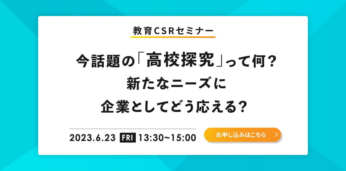 そこで、実際に高校で行われている「探究」の実態や教員ニーズ、すでに取り組んでいる企業の先行事例などを紹介するセミナーを開催いたします。