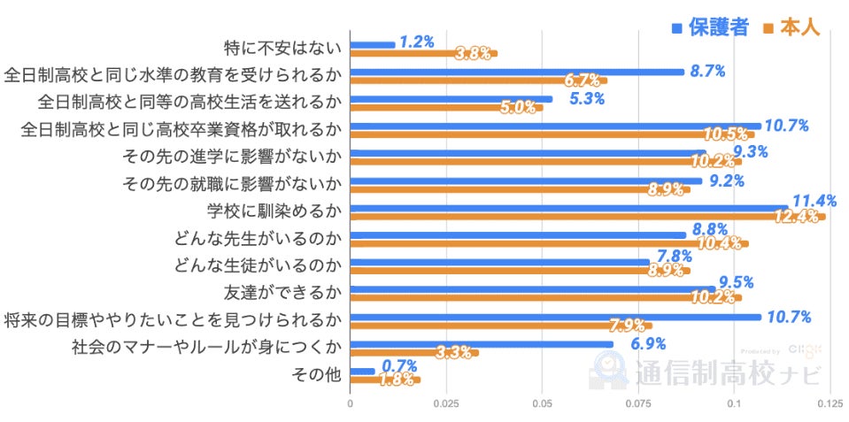 前回調査で最も多かった回答は、保護者が「将来の目標ややりたいことを見つけられるか」(12.4%)、本人が「友達ができるか」(11.5%)でしたが、今回は、保護者・本人ともに「学校に馴染めるか」(保護者12.4%、本人11.4%)が最多でした。