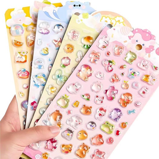 ドロップシールは、透明樹脂による立体感とキャンディのようなツヤ感が特徴の「ぷっくり立体シール」です。「印刷 → 厚盛り樹脂加工 → 硬化 → 精密カット」という特殊4工程で製造され、平面シールにはない写真映えと、思わず触りたくなる手触りを実現します。