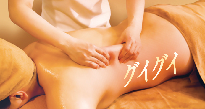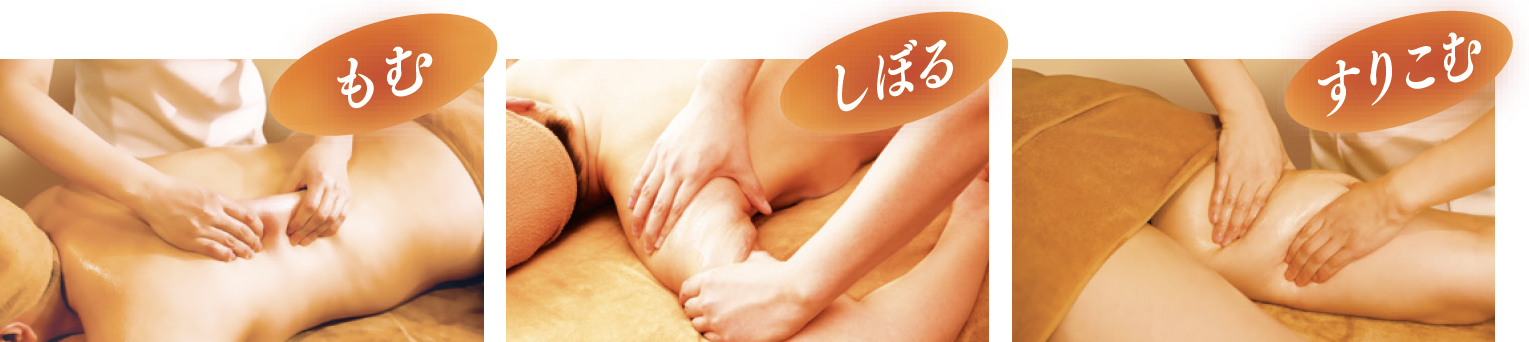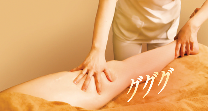 ハーブをすりこむように上昇円運動。気になる太ももやお尻、二の腕、腰まわりはしぼるようなテクニックで徹底的にケアします。