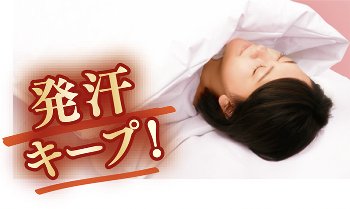 全身をヒートマットで包み込み発汗促進。頭皮ケア(約5分)も施し、施術後は身も心もリフレッシュ。