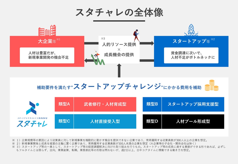 『スタチャレ』は、大企業の若手・中堅人材等がスタートアップ等での実務に挑戦し、成長過程での課題解決に取り組む「スタートアップチャレンジ」の活動にかかる費用の一部を助成することで、人材への成長機会付与と、スタートアップの人材不足解消を支援する取り組みです。