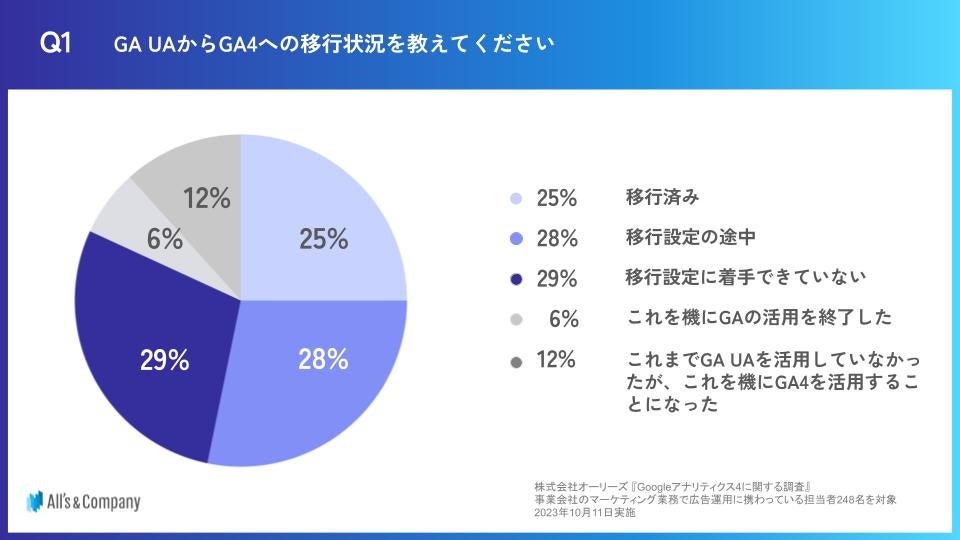 「Q1.GA UAからGA4への移行状況」(n=248)という質問に対しては、「移行済み」と回答した企業が25%、「移行設定の途中」と回答した企業が28%という結果になりました。