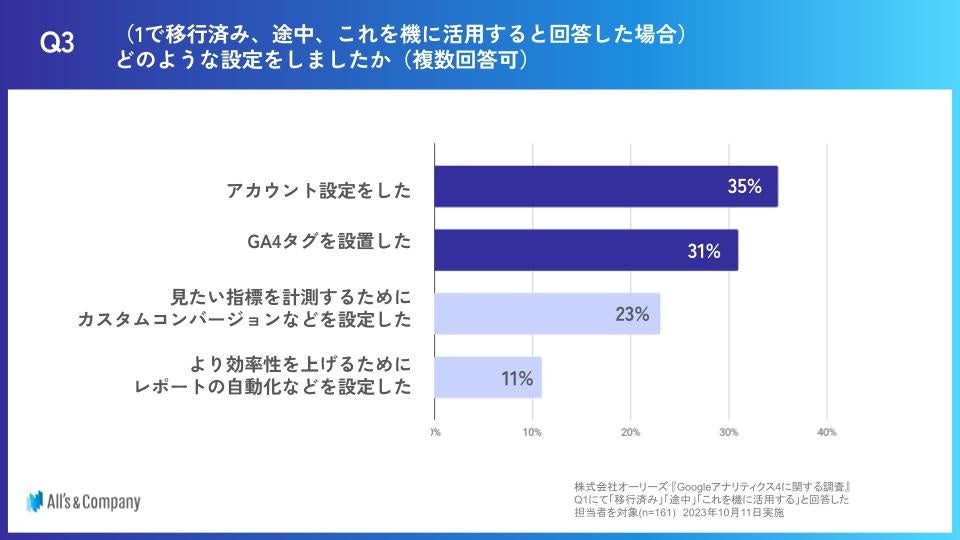 また「どのような設定をしましたか」と質問したところ、基本設定である「アカウント設定をした」が35%、「GA4タグを設置した」が31%、カスタマイズ設定である「見たい指標を計測するためにカスタムコンバージョンなどを設定した」が23%、「より効率性を上げるためにレポートの自動化などを設定した」は11%でした。