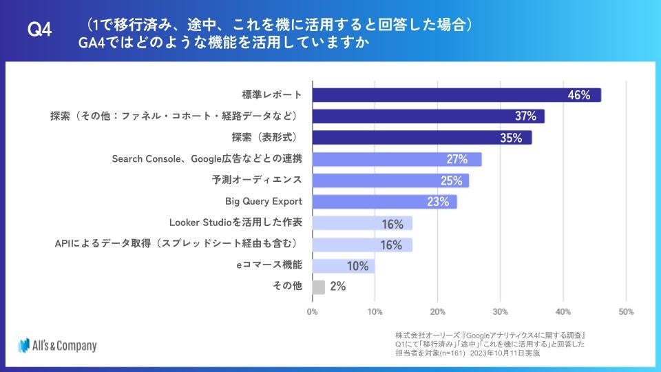 一方、GA4から新しく実装された機能の、予測オーディエンスは25%、Big Query Exportは23%で、まだまだ活用の余地があることがわかります。