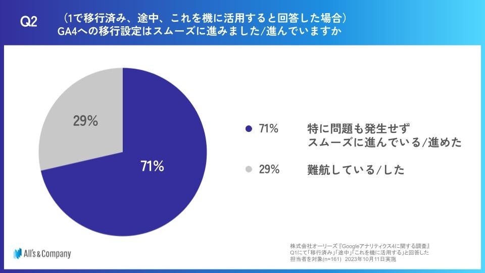 つづいてGA4に移行済み、移行途中、これを機に活用すると回答した161名を対象に、「GA4への移行設定はスムーズに進みましたか/進んでいますか」と質問したところ、「特に問題も発生せずスムーズに進んでいる/進めた」と回答した割合は71%でした。