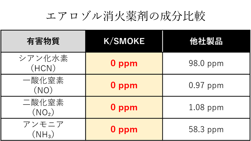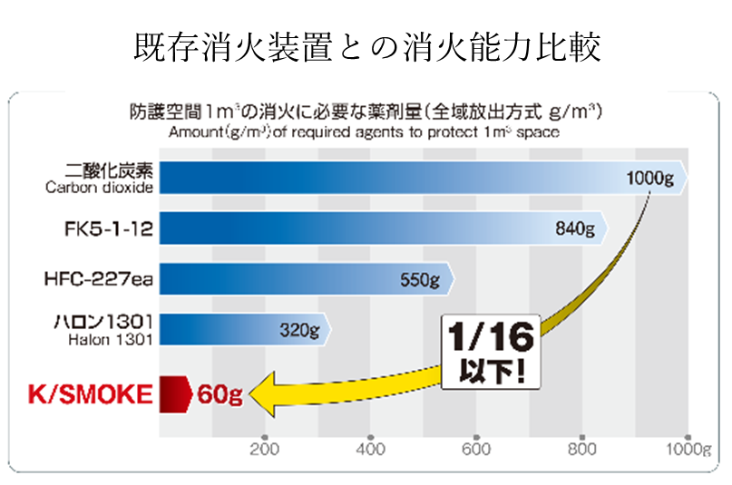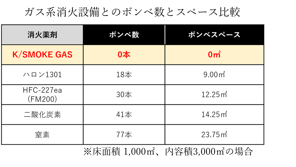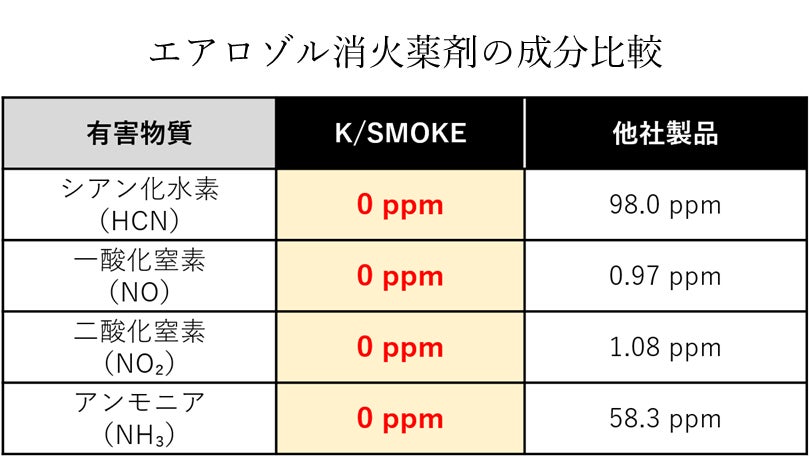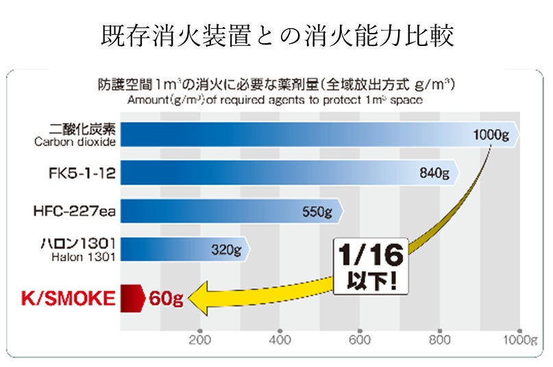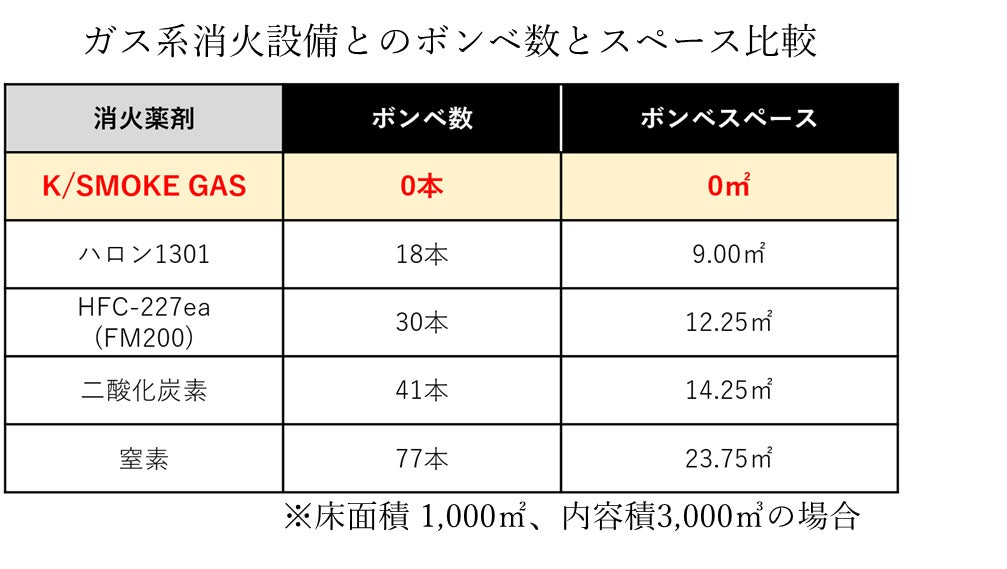 「K/SMOKE GAS」は、人体安全性に配慮した薬剤を用い、地球温暖化係数(GWP)およびオゾン破壊係数(ODP)がともにゼロで、ボンベや配管を要しない設計により、施工や保守の負担軽減も期待されます。