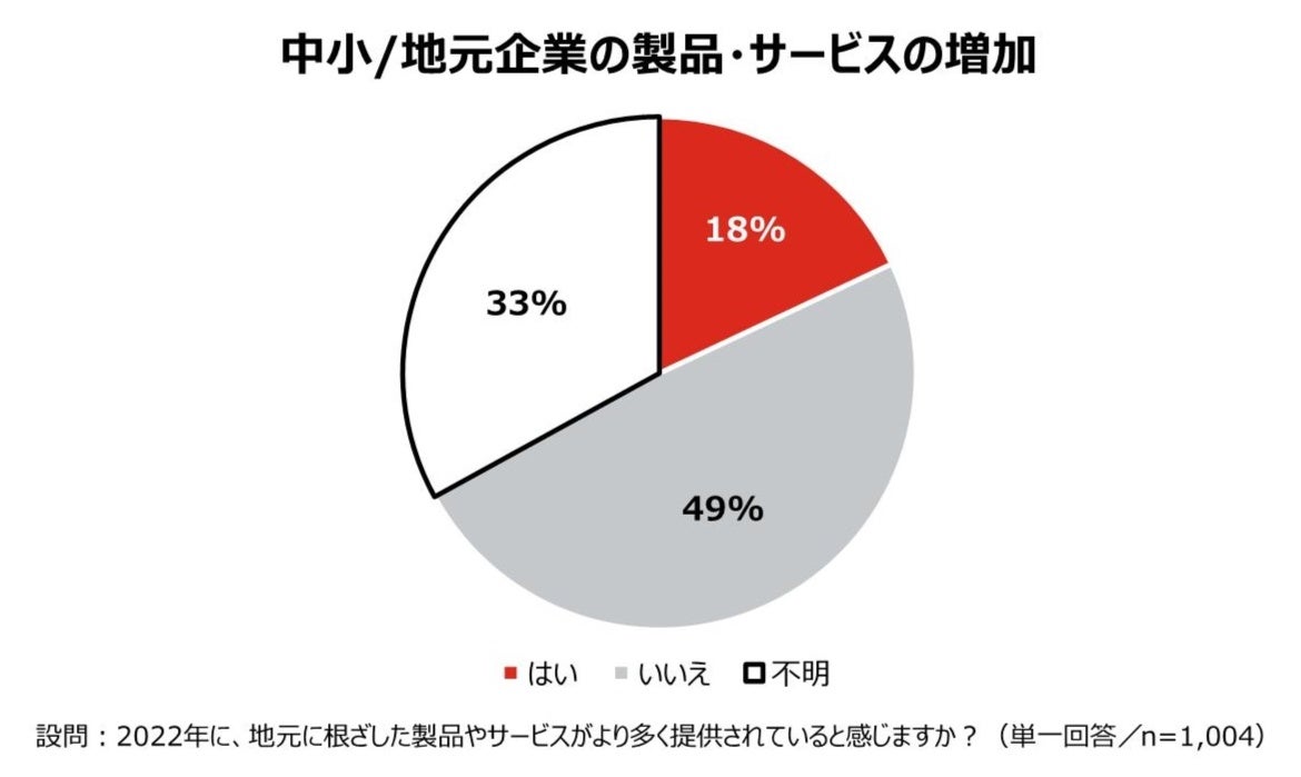 「2022年に、地元に根ざした製品やサービスがより多く提供されていると感じるか」と尋ねたところ、その増加を実感しているのは18%であり、中小/地元企業の認知度不足が伺い知れる結果となった。