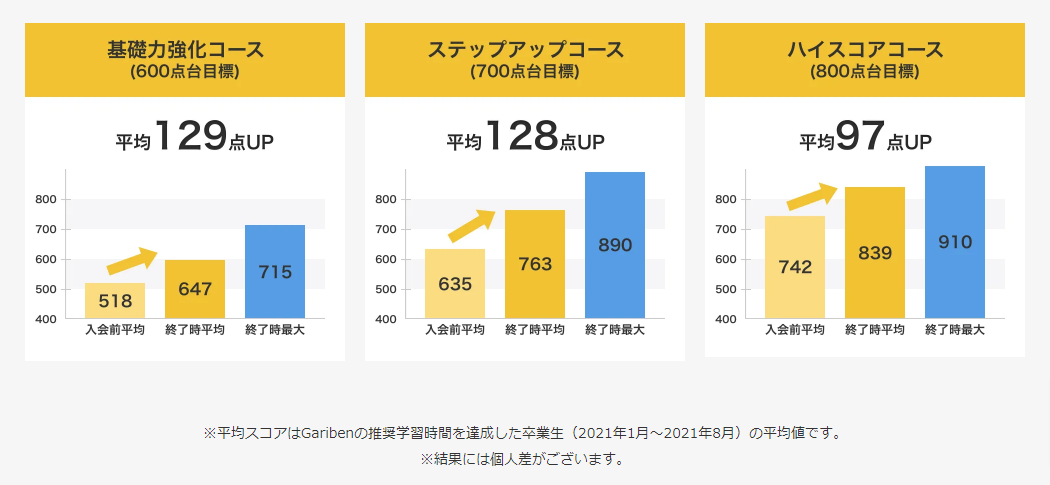 2022年4月18日に開始したGariben4期生が先日無事卒業を迎えました。最高スコア970点を取得された方や、スコアアップ幅では3ヶ月で210点アップをされた卒業生も。卒業生の声では「Garibenを受講できて本当によかったです。点数が伸びたことももちろんですが、学習の習慣化ができたことがとても大きいです!」「他社のサービスと比べても、学習とコストのバランスで見て安いと感じました。」などの声をいただきました。