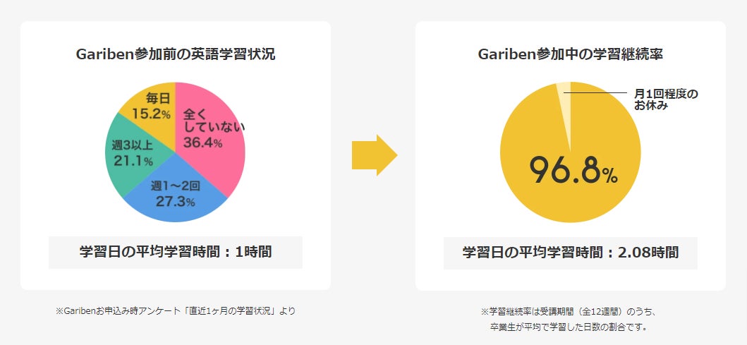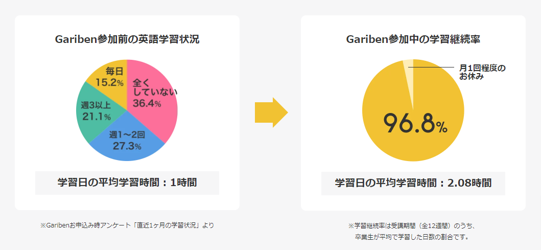 Gariben参加者が誇る学習継続率96.8%は、英語学習の継続は仕組みが確実に解決しうることを物語っています。