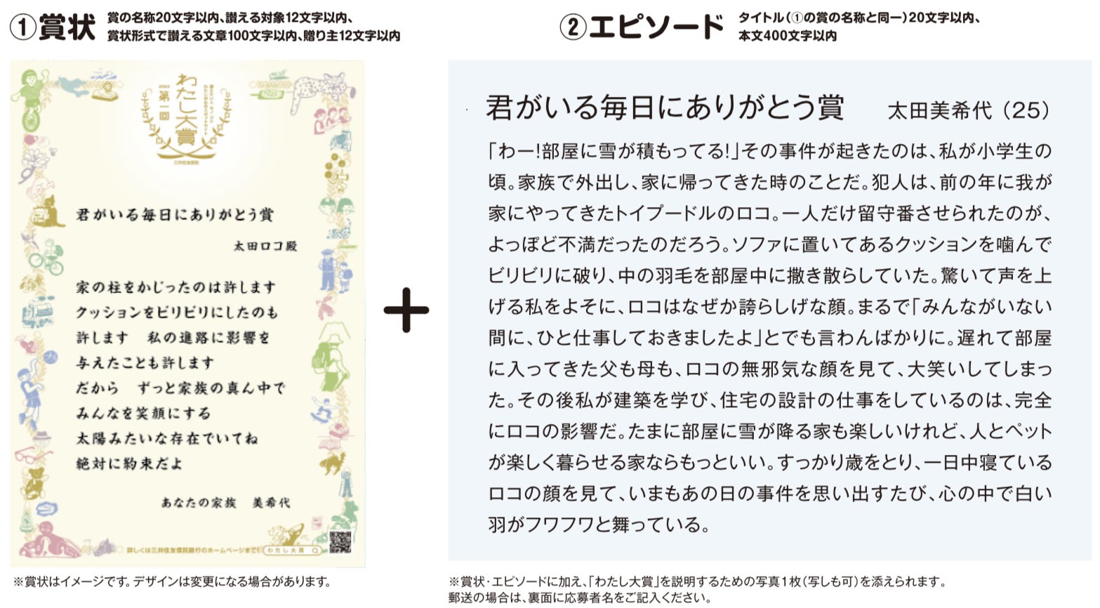 新企画「わたし大賞」は、わたしだけの「大賞」を賞状という形式に託し、そのエピソードとともに応募いただきます。一人ひとりの心を動かした「人 モノ コト」に光を当て、賞状とエピソードにして讃え、書く人読む人の前向きな気持を共有することで、みなさまや社会の「幸せ」を創造する活動です。第1回は、6月27日より学校向けに先行案内を開始し、8月1日から募集を開始します。
