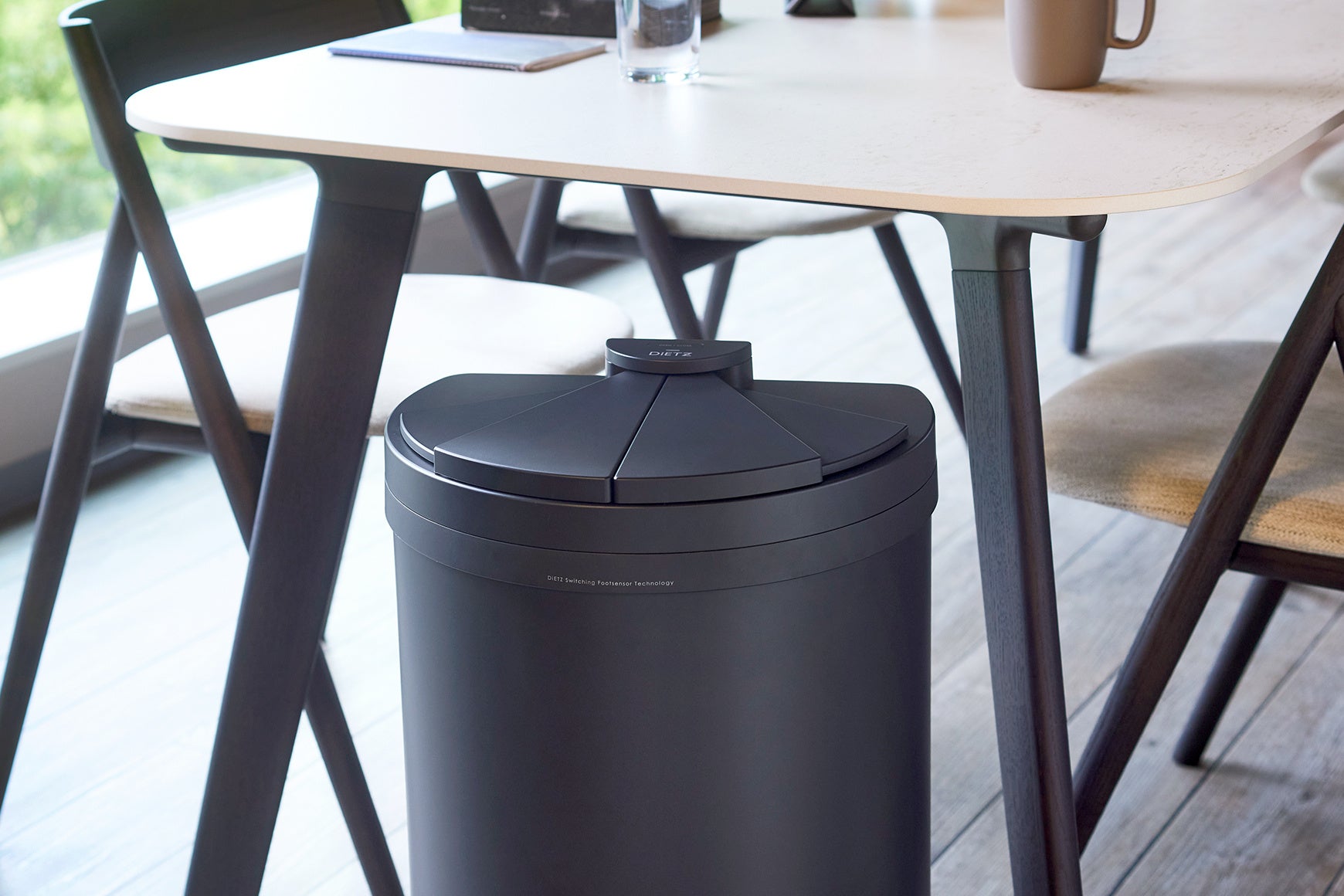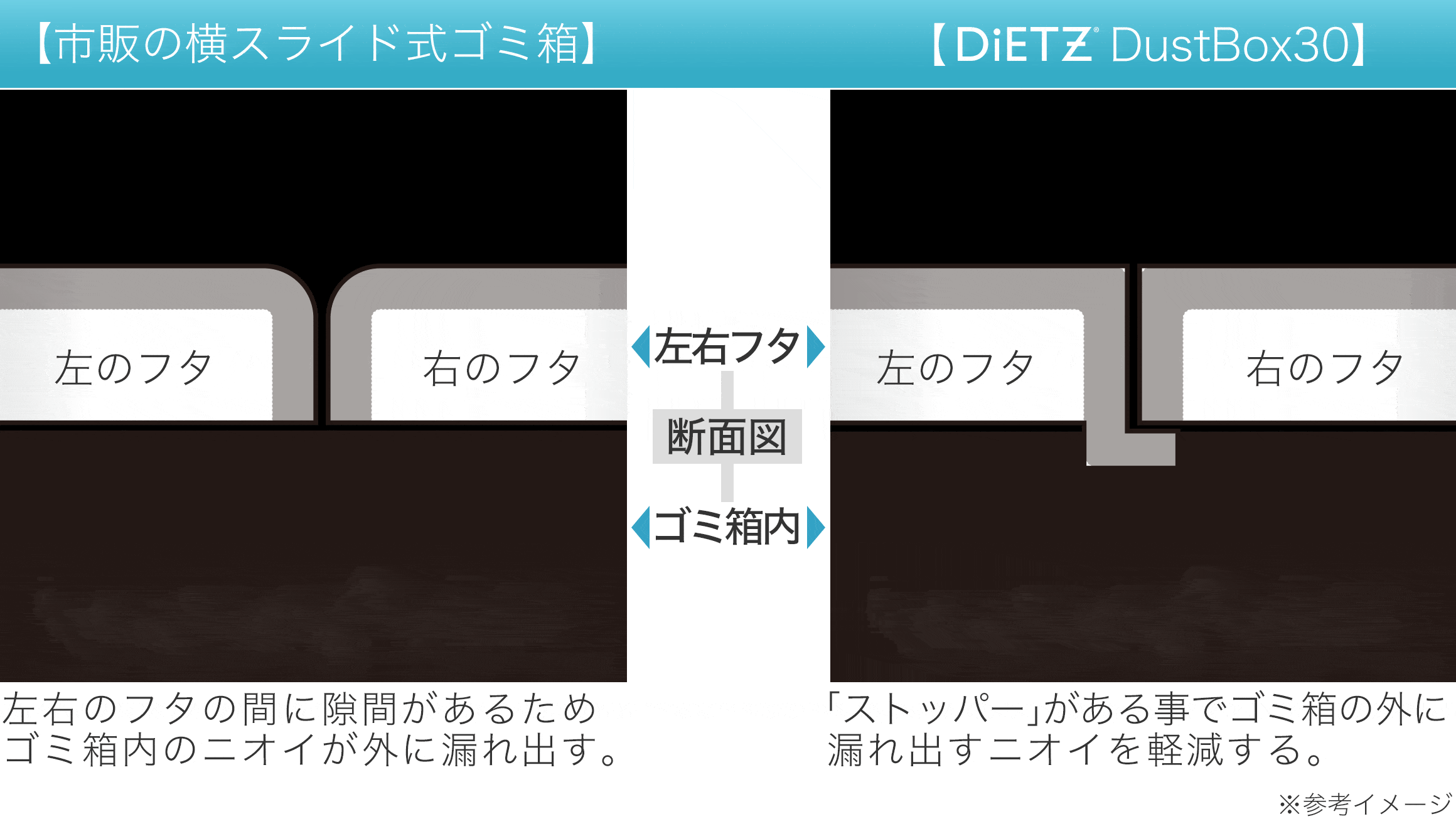 DiETZ(ディーツ)DustBox30のフタは縦開きではなく、横スライド式のフタを採用しております。縦開きのフタとは違いゴミ箱上部のデッドスペースを気にする必要がなくなったので、カウンターやデスクの下でもご使用が可能になりました。