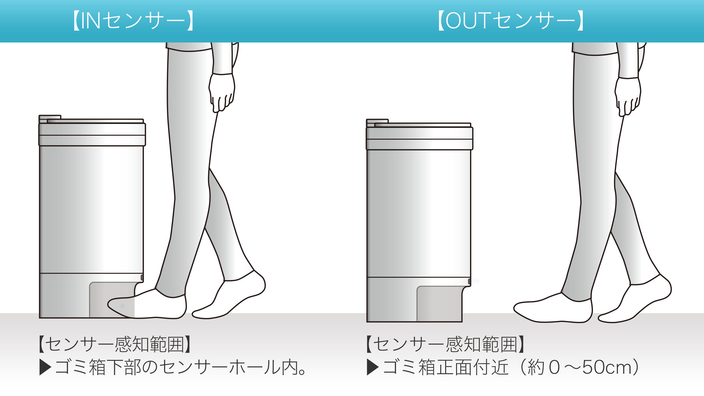 | センサー | 【IN】 赤外線センサー(感知範囲:本体内側ゴミ箱下部センサーホール内) 【OUT】 赤外線センサー(感知範囲:0〜50cm) ※「IN」「OUT」センサー共にセンサーの感知範囲から離れると感知ランプが点滅を 始め約3 秒後にスライド扉が閉じます。 ※センサーが感知している間はフタは開いたままの状態です。 |