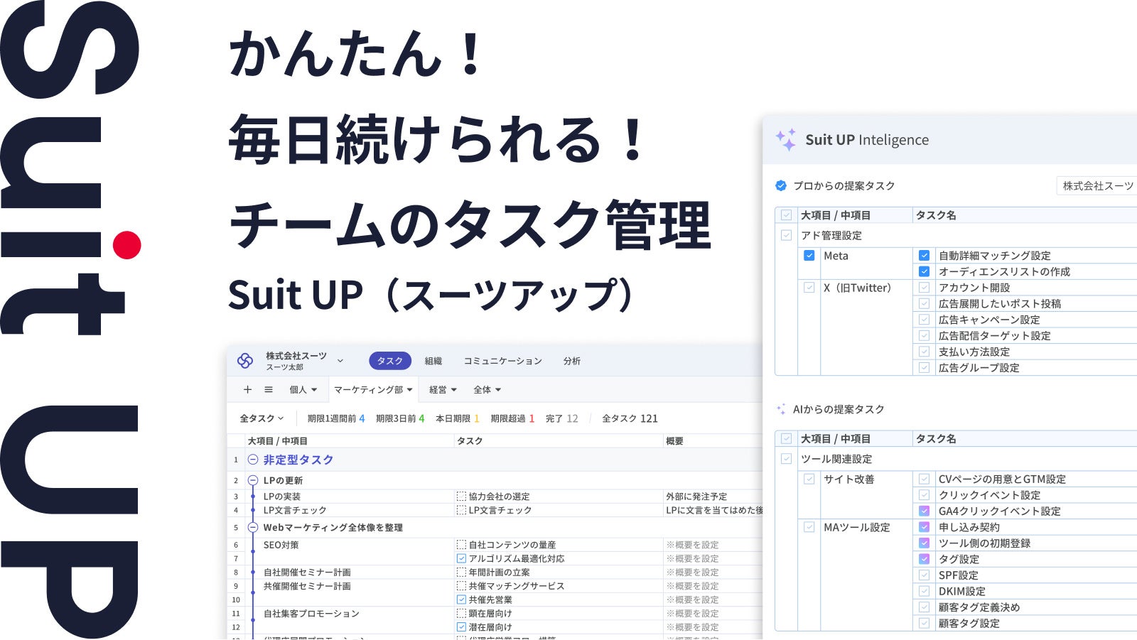 今般、2024年4月10日より、「かんたん!毎日続けられる!チームのタスク管理」にキャッチコピーを一新して、スーツアップβ版のサービス提供を開始いたします。
