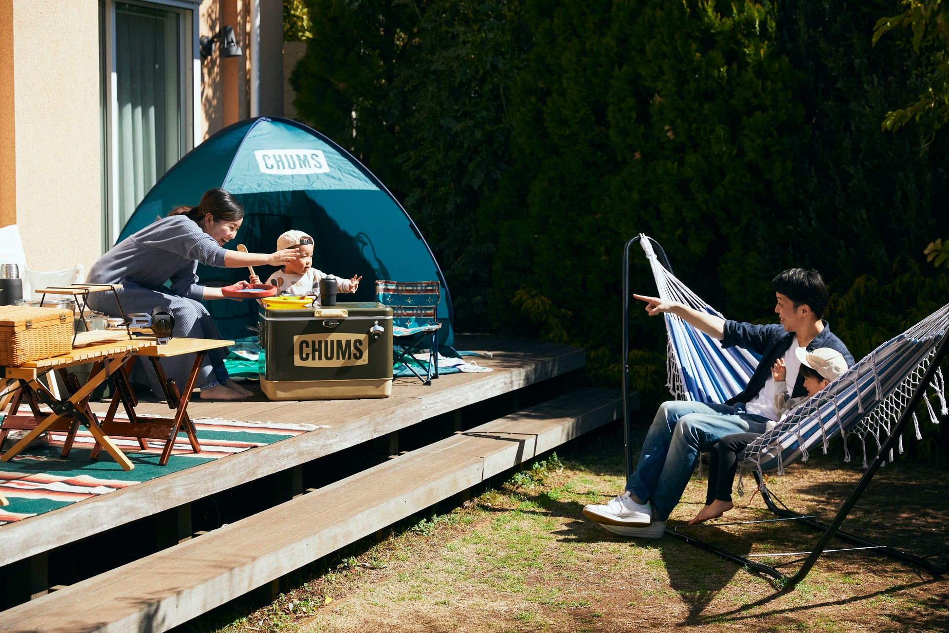 ・庭でキャンプをするのにテントを設営したり、まきで火を起こして料理をしたりして楽しんでいます