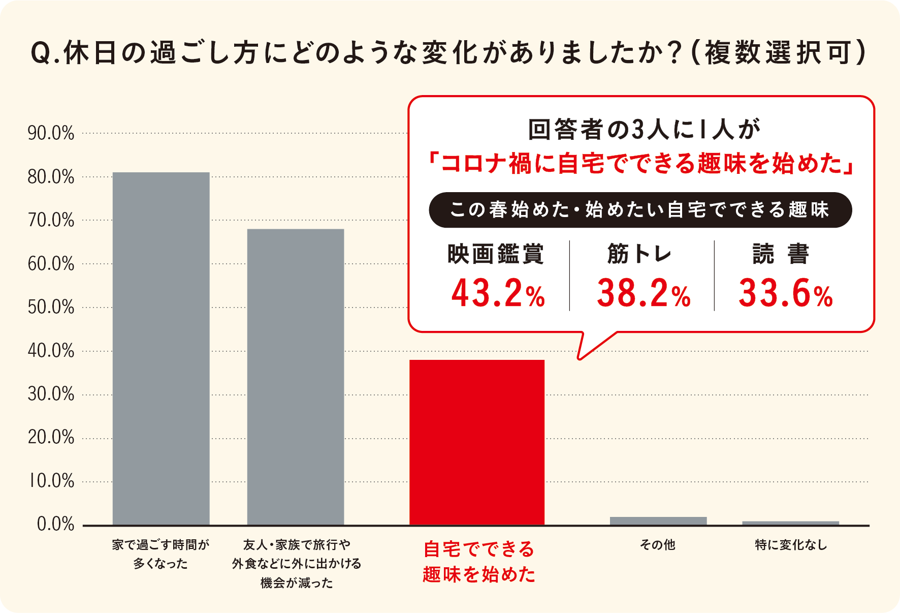 今回の調査で、「コロナ禍で休日の、自宅での過ごし方に変化があったか」を聞いたところ、約6割の人が「変化があった」(59.3%)と回答し、「どういう変化があったのか」を尋ねたところ、「家で過ごす時間が多くなった」(80.8%)、「友人・家族で旅行や外食など外に出かける機会が減った」(67.4%)、「自宅でできる趣味を始めた」(37.7%)という回答になりました。