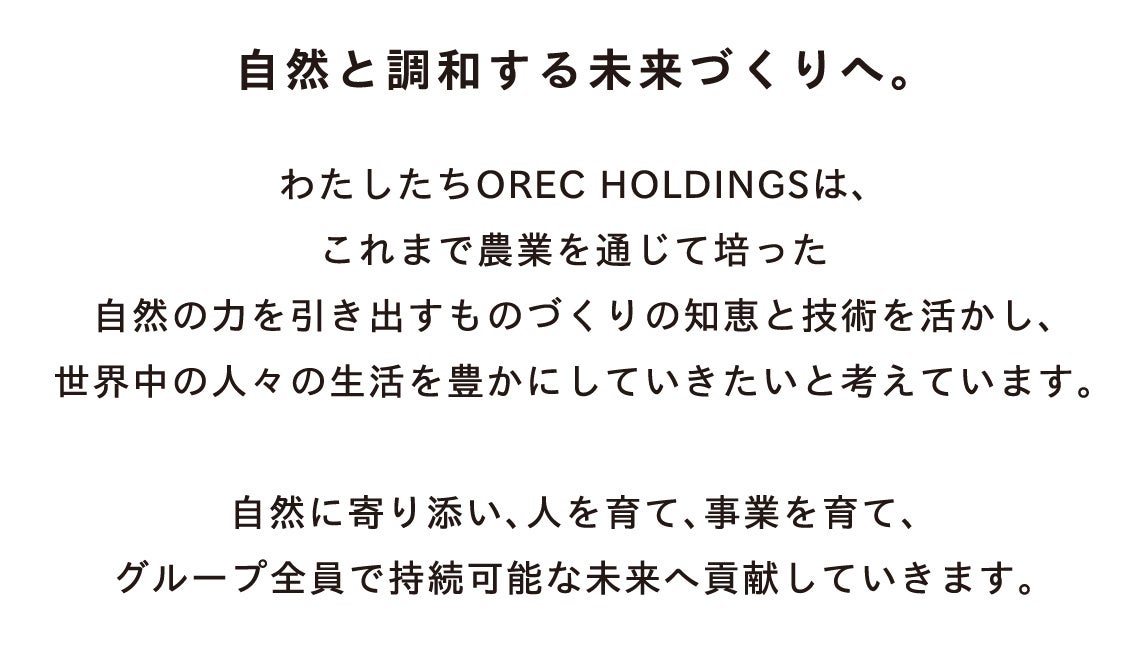 オーレックホールディングスにおけるあらゆる活動の判断基準として、ブランドコンセプト「自然と調和する未来づくりへ。」を開発。「世の中に役立つものを誰よりも先に創る」という創業精神のもと、持続可能な社会と農業の確立、健康な食と環境づくりに向けて、農業に軸足を置いた幅広い分野で社会貢献を果たしていくという思いが込められています。