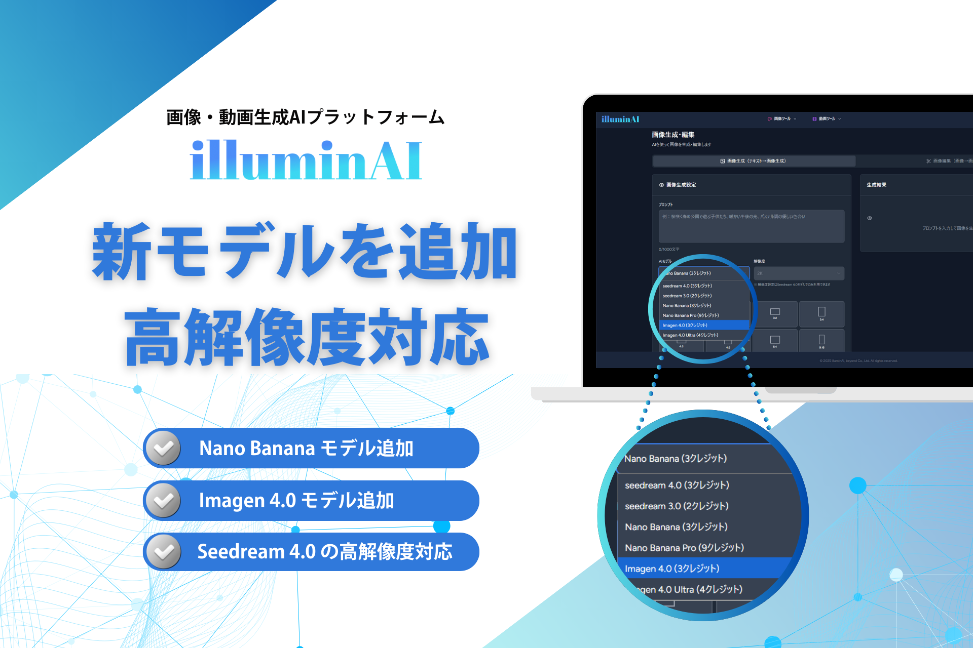 クラウドサーバーのマネージドサービス事業やシステム開発事業を提供する、株式会社ビヨンド(本社:大阪市)は、テキストを入力するだけで高品質な画像・動画が生成可能なAIプラットフォーム「illuminAI(イルミンエーアイ)」において、Google系最新生成AIモデル「Nano Banana」および「Imagen 4」シリーズの追加を含む大規模なアップデートを実施しました。これにより、ユーザーはより多様な用途に合わせて柔軟にモデルを選択できるようになります。