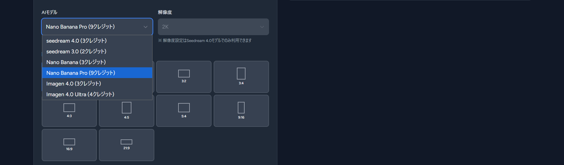 新モデルとして、Google系の「Nano Banana」「Nano Banana Pro」「Imagen 4」「Imagen 4 Ultra」モデルを追加しました。「Nano Bananaシリーズ」は、テキストからの画像生成と画像からの画像生成の両方をサポートし、「Imagen 4シリーズ」は、テキストからの画像生成に特化しています。