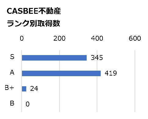 ・CASBEE不動産のランク別ではB+ランク24件、Aランク419件、Sランク345件で、S・Aランクが97%と大半を占めており、基本的に高ランクの取得が目立ちました。