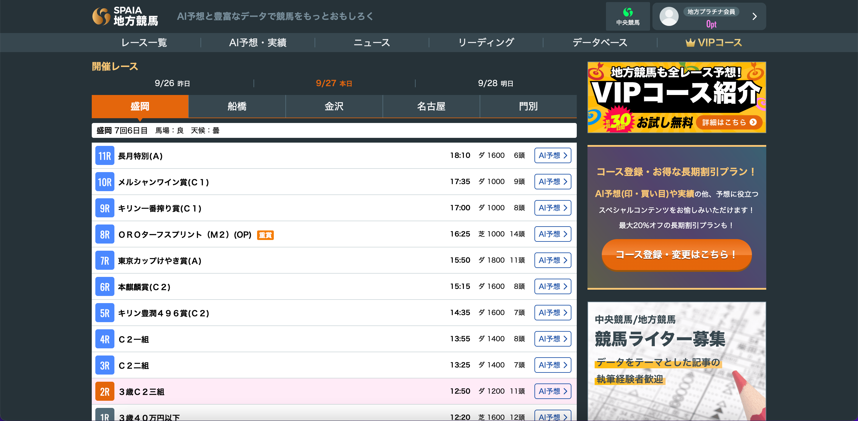 ・AI 予想家分析:様々な要素を分析した個性豊かな AI 予想家が全レースの印と買い目を配信しています。VIP コースへのご登録で予想印をご確認いただけます。