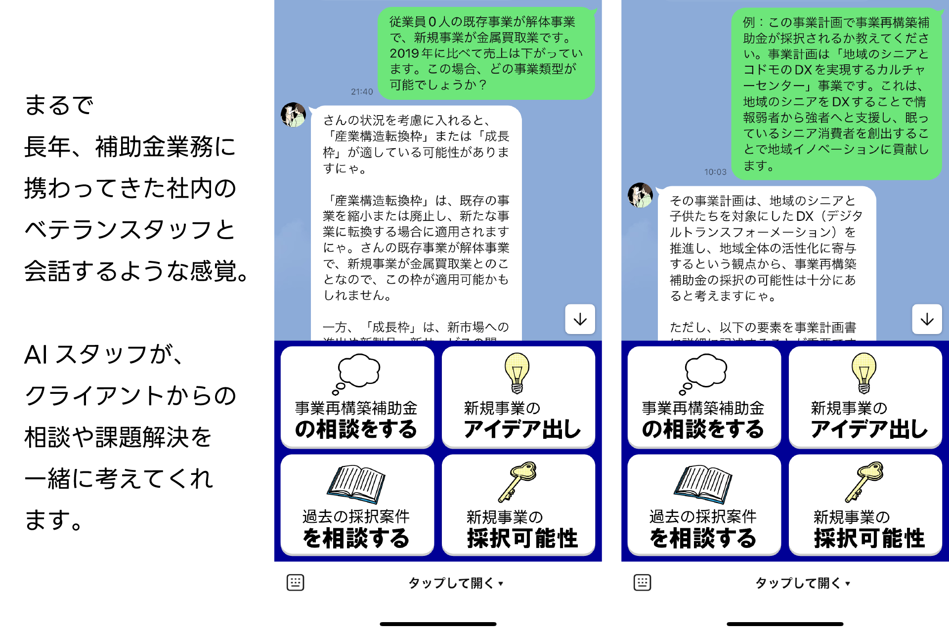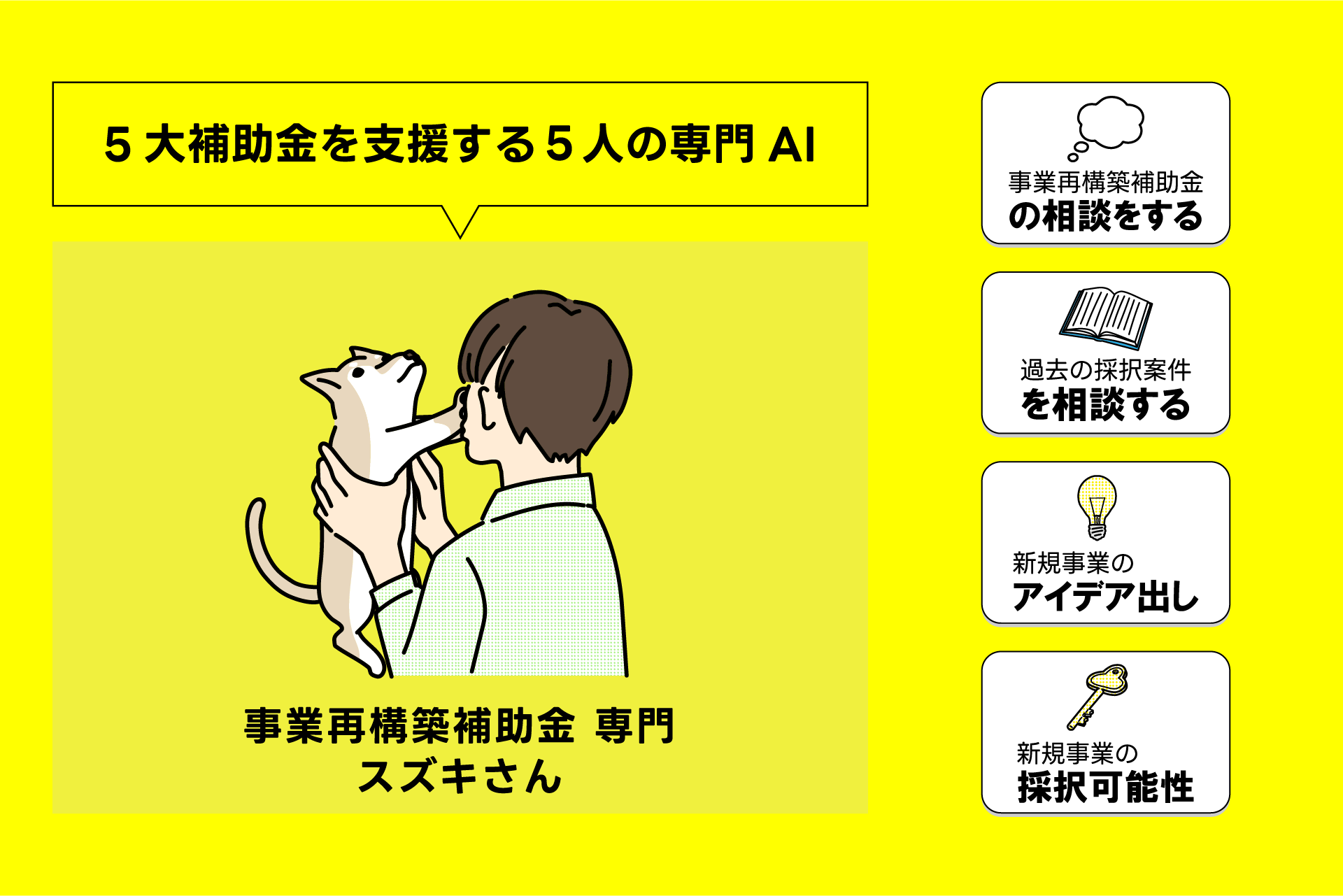 補助金支援機関の人材不足を解決するAI派遣スタッフ。5大補助金を一気に効率化する『ビジネスエキスパートAI』の一人目は、事業再構築補助金の専門AI「スズキさん」が登場。